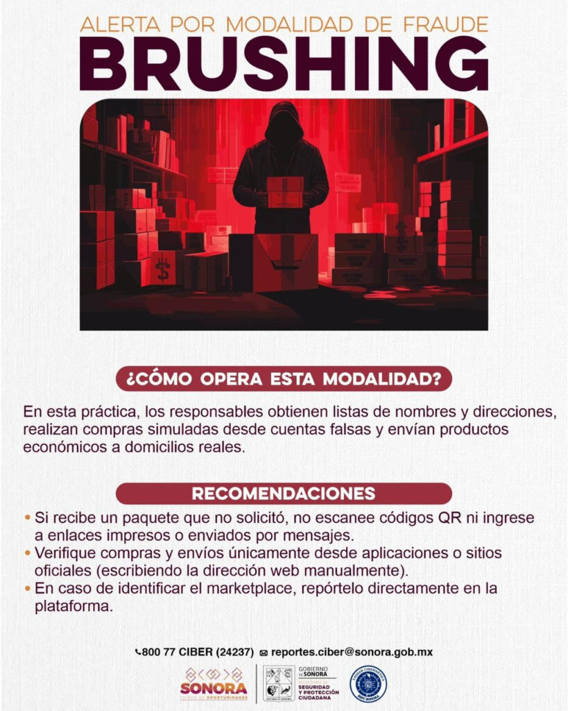 La Secretaría de Seguridad y Protección Ciudadana de Sonora emitió una alerta preventiva ante la modalidad de fraude conocida como “Brushing”, que consiste en el envío de paquetes no solicitados a domicilios reales, utilizando datos personales obtenidos sin consentimiento.