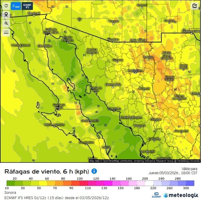 De acuerdo con el pronóstico, las rachas podrían superar los 70 kilómetros por hora en los sectores este y noroeste del estado. En el resto de Sonora se estiman velocidades entre los 40 y 60 kilómetros por hora.