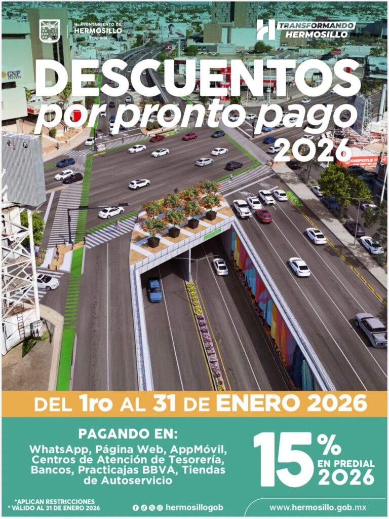 Durante todo el mes de enero, el Ayuntamiento de Hermosillo aplicará un 15% de descuento por pronto pago en el Predial 2026, beneficio vigente del 1 al 31 de enero y aplicable en todas las modalidades de pago.