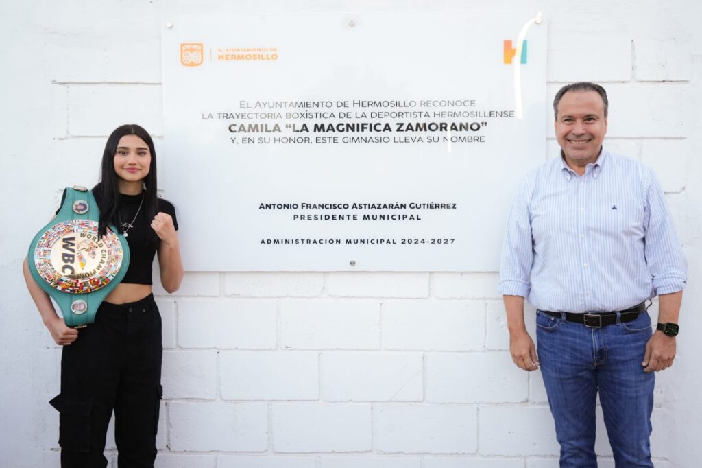 El alcalde Antonio Astiazarán entregó la rehabilitación de un gimnasio de box en Bahía de Kino, al que se le asignó el nombre de la campeona mundial hermosillense Camila “La Magnífica” Zamorano, además de anunciar mejoras en infraestructura deportiva en la comunidad.